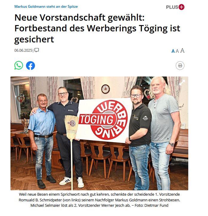 Der Fortbestand des Werberings Töging (Landkreis Altötting) ist gesichert: Bei einer außerordentlichen Versammlung am Donnerstag in „Selle’s Einkehr zum Müllerbräu“ wurde Markus Goldmann zum Nachfolger von Romuald Schmidpeter als Vorsitzender gewählt.